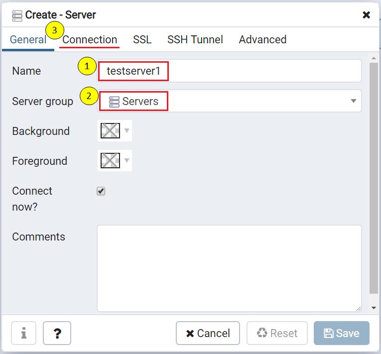 2.「Name」にサーバー名を入力し、作成するサーバーが所属するサーバーグループ「Server group」を選択します。完了後、「Connection」タブをクリックします。