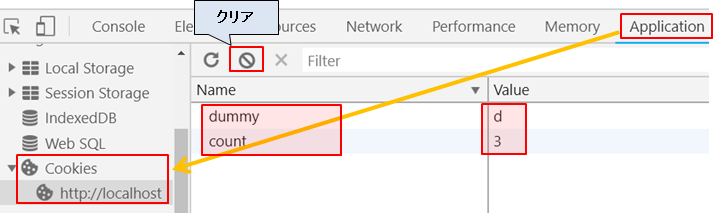 「F12」キーを押してデベロッパーツールを開き、「Application」→「Cookies」→「http://localhost」をクリックします。