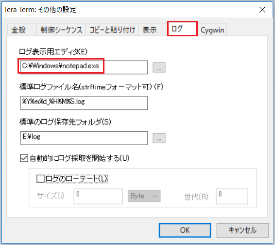 2.「ログ」タブをクリックし、「標準のログ保存先フォルダ」を指定し、「自動的にログ採取を開始する」にチェックを入れOKボタンを押します。