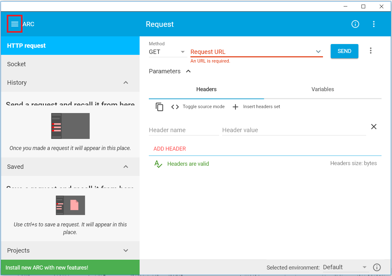 Advanced REST clientを起動すると以下の画面が表示されます。