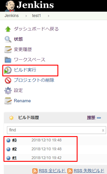 5.ビルド実行を何回かクリックするとその分ビルドが実行されて履歴が増えていきます。