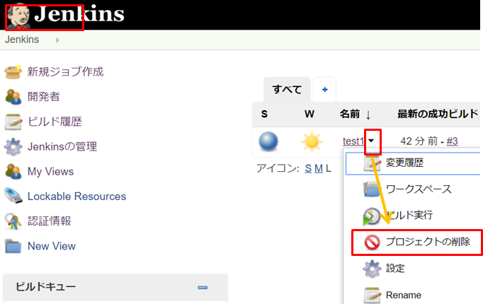 Jenkinsの左上をクリックしてトップページに戻り、名前の横の三角を押して、「プロジェクトの削除」をクリックすると削除できます。