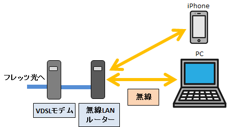 NTTのVDSLモデムから無線LANルーターを介してPCやiPhoneに繋いでいます。