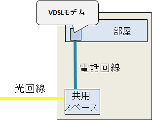 VDSLモデムまでの経路は、外から共用スペースまでは、光回線です。