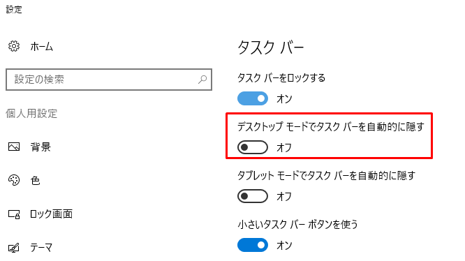 3.「デスクトップ モードでタスクバーを自動的に隠す」をオンにするとタスクバーが隠れます。