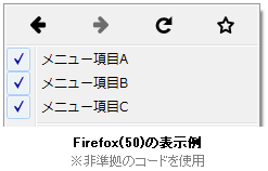 <menuitem type="checkbox" label="メニュー項目A" onclick="alert('メニュー項目Aのアラート');" title="メニュー項目Aの説明" checked>