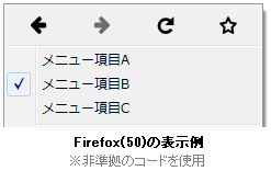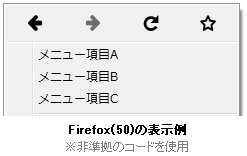 非準拠のコードなりますが、以下のHTMLコードをコピーしてFirefoxで表示させると、ポップアップメニューの機能を確認することができます。(あくまで確認用としてご利用ください)