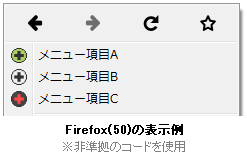 Firefox(50)では、menuitem要素に終了タグを付けることで、ポップアップメニューが機能するようになります。(終了タグがないと1つ目のメニュー項目しか表示されません)