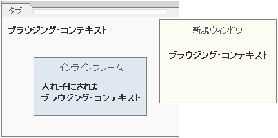 HTML5では、文書が表示される環境(ウィンドウやタブ等)のことをブラウジング・コンテキストと呼ぶようになりました。また、インラインフレームなども入れ子にされたブラウジング・コンテキスト(nested browsing contexts)と呼ばれています。