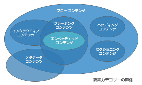 エンベッディッド・コンテンツに属する要素は、同時にフレージング・コンテンツとフロー・コンテンツにも属しています。
