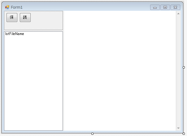 この点の改良は個人のセンスの問題もありますし、技術的な問題もありますが、なんといって「保」ボタンと「読」ボタンがださいです。ここを何とかするにはそれなりに知識が必要となってきますがやはりVBのツールバー機能を利用するとよいでしょう。ツールバーを配置するにはToolStripコントロール(読み方:ToolStrip = トゥールストリップ)を使用しますが始めての方は苦労するでしょう。余力があればチャレンジしてみてください。