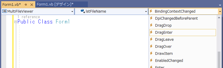 DragEnterイベントハンドラーを生成するには、たとえば、ナビゲーションバーで「lstFileName」が選択されている状態で「DragEnter」を選択します。