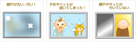 網戸が古くなってしまった! 汚い! 子供やペットが破いてしまった! サッシが付いてない!