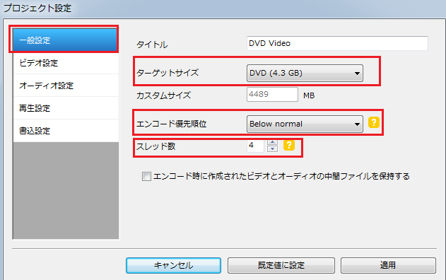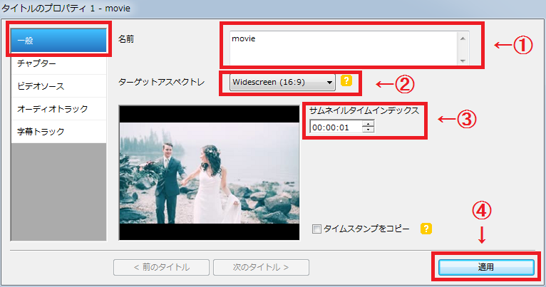 結婚式用にDVDを作成するのであれば、タイトル編集は基本的にこの「一般」の設定だけいじれば大丈夫です。