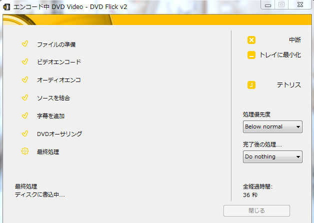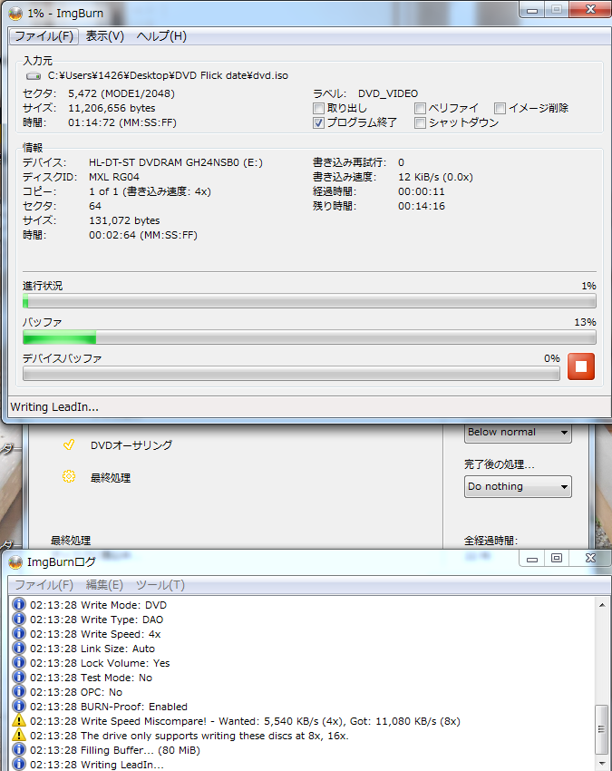 DVD Flickで動画が変換されたら、自動的にImgBurnが起動してDVDへの書き込みも全自動で行ってくれます。