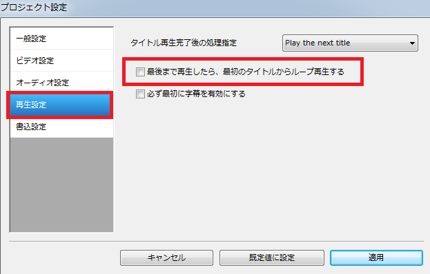 「再生設定」では、結婚式場でDVDを流す用途で考えている人はひとつ注意点があります。