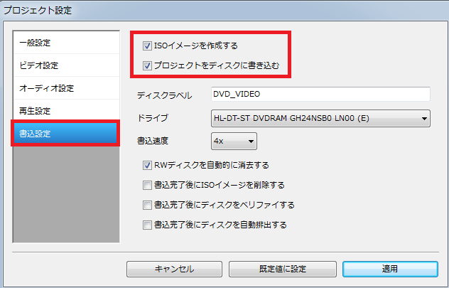 「書込設定」では、「プロジェクトをディスクに書き込む」の項目に必ずチェックを入れておきましょう。↓