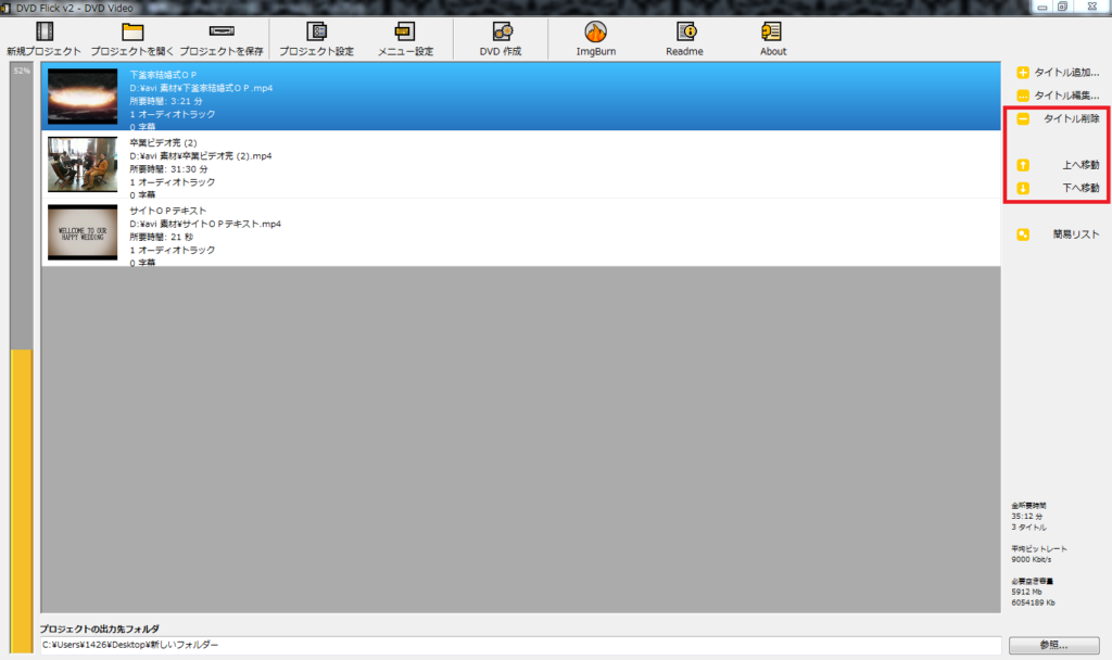 赤枠で囲った箇所でDVDへの書き込みの順番を変えたり、データを削除したりできます。