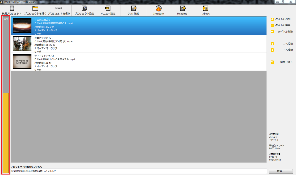 左側の↓この部分は、動画データの容量が入れ込んだDVDの容量の何%にあたるかを示したグラフになります。