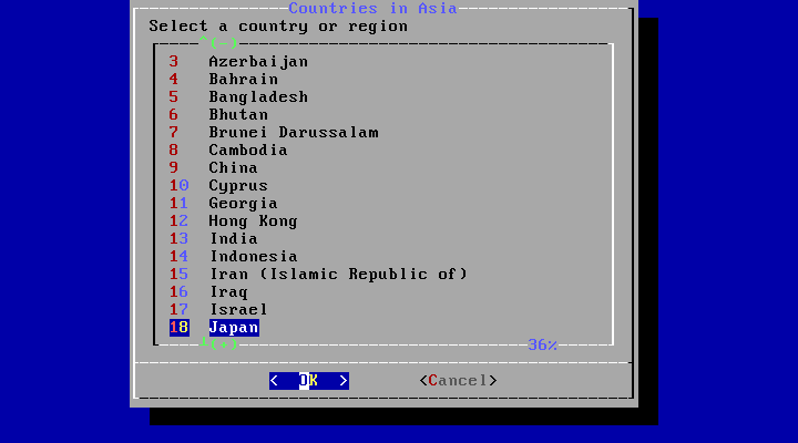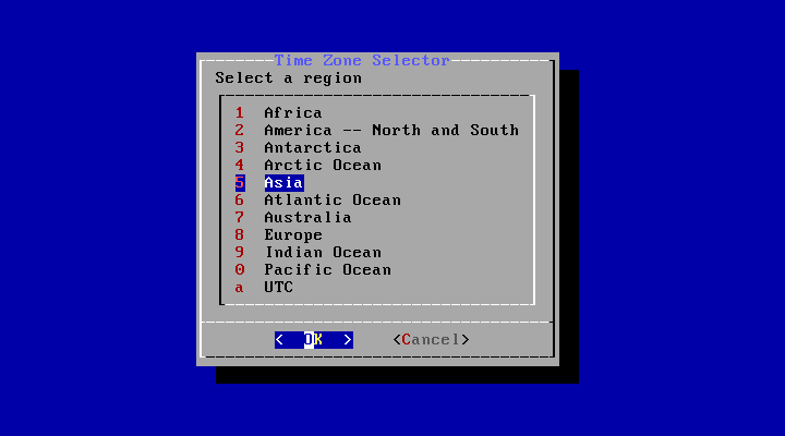 1. タイムゾーン設定 前ページからの続きです。 タイムゾーンの設定へと移行します。 「Asia」を選択して Enter