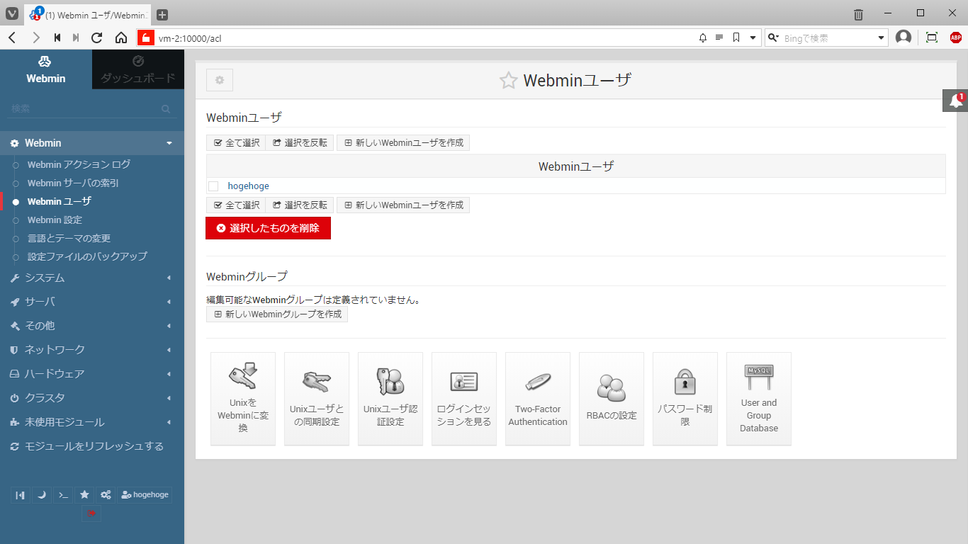 1. 概要 「Webmin」は、サーバの設定を変更することができます。 以下の項目で最低限のセキュリティ対策は行っておきましょう。 2. ユーザ・パスワードの変更 「Webmin」→「Webmin ユーザ」でユーザを追加・削除・変更したり、パスワードを変更したりできます。