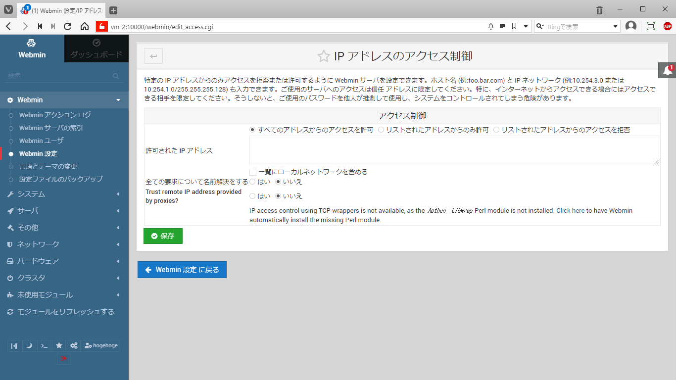 3. IP アドレス制御 「Webmin」→「Webmin 設定」 「IP アドレスのアクセス制御」