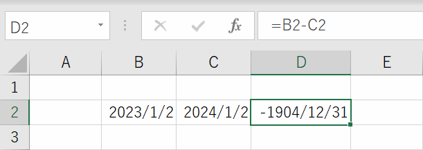 その場合は、再度日付を手入力で打ち直しをしてください。マイナス1年分なので、-365と正しい値が計算されました。