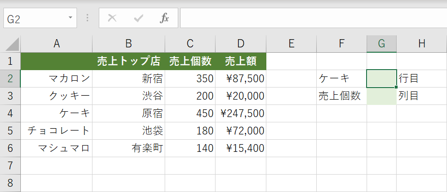 まずは上記の表を準備しましょう。今回の目的としてはケーキが何行目にあるのか、売上個数が何列目にあるかを求めるとします。
