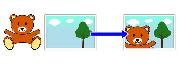 上図のようにクマを移動して写真に重ねます。 重なったのはいいですが、クマが写真よりも背面に位置しています。 キーボードのHOMEキーを押してクマを最前面に移動しましょう