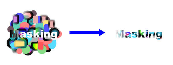上図のようにカラフルなオブジェクト群がマスキングされます。 テキストの形状に切り抜かれ、左端から "a" の文字の中間地点にかけてグラデーションがかかっています