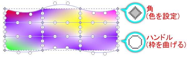 メッシュの網目の各交差点は『角』と呼ばれ、それぞれの角に色を設定することでグラデーションを作り出すことができます。 また、メッシュの枠はハンドルで変形させることができます。