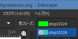 上図のようにフィル/ストロークダイアログの色フェーズの一覧の終点をマウスの左ボタン(マウスの左ボタン)でクリックします。 名前ではどれが終点かは判断できませんので、左の色で判断しましょう。 色の右半分が透明を表す市松模様であることから、終点であることがわかります