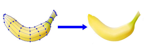 メッシュグラデーションとは、メッシュと呼ばれる格子状(または円錐状)の網目状の枠を使用したグラデーションの機能です。 メッシュの網目の各交差点のそれぞれに色を設定することでグラデーションを作り出すことができます。 また、メッシュの枠はハンドルで変形させることができます。