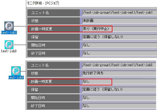 5.ジョブの詳細の「計画一時変更」を見るとtest-job1は「あり(実行中止)」、test-job3は「なし」になっています。確認が終了したら右上のバツのアイコンをクリックして閉じます。