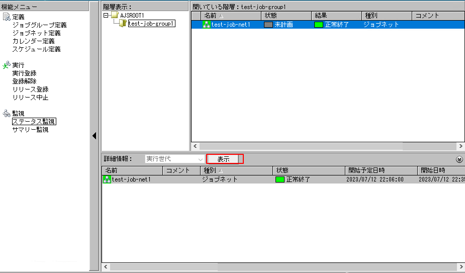 1.機能メニューで「ステータス監視」を選択し中央の「表示」ボタンを押して下の枠にジョブネットを表示します。
