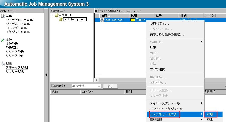 1.機能メニューで「ステータス監視」を選択しジョブネットを右クリックし「ジョブネットモニタ」>「状態」をクリックします。