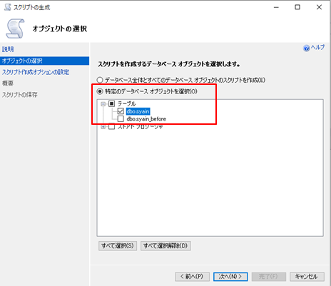 3.「特定のデータベースオブジェクトを選択」をチェックし、出力するデータのテーブルにチェックを入れます。
