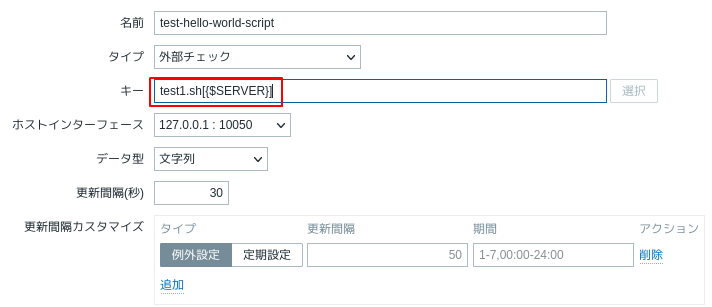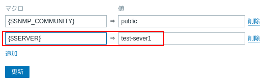 3.追加のリンクをクリックして、マクロに{$SERVER}、値にtest-sever1と設定し更新ボタンを押します。