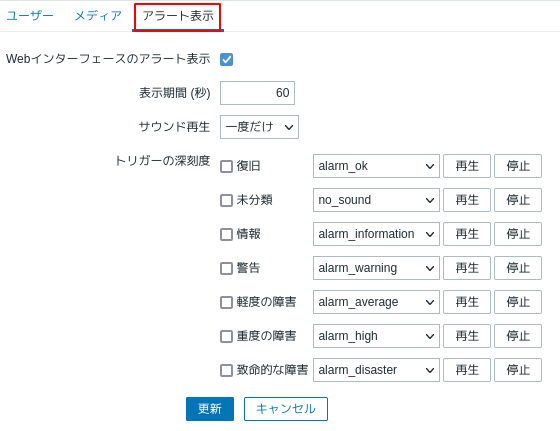 Zabbixの障害発生時に音を鳴らす設定のサンプルです。