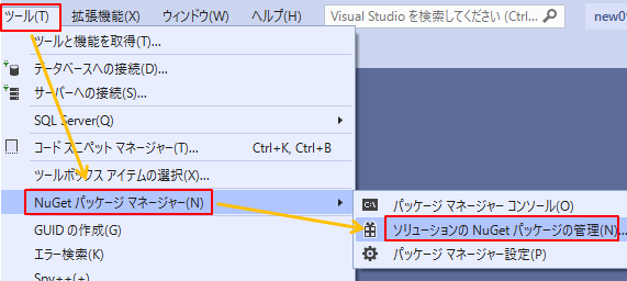 1.ツール→NuGetパッケージマネージャー→ソリューションのNuGetパッケージの管理をクリックします。
