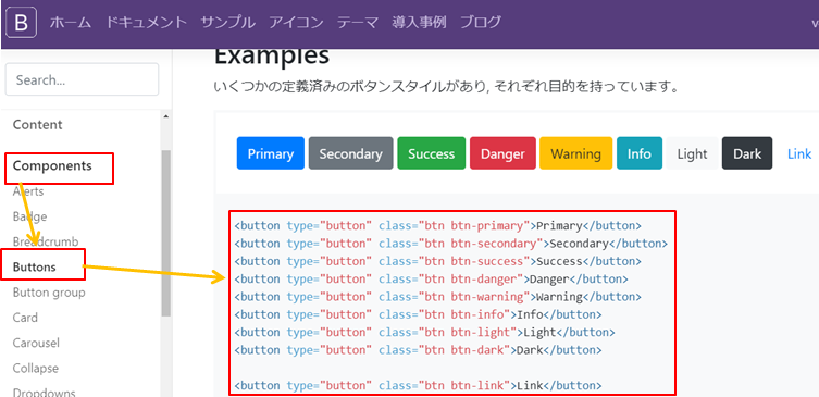 Components→Buttonsをクリックし、表示されたコードをコピーします。