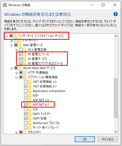 IIS管理コンソールやASP.NET4.7等にチェックを入れました。