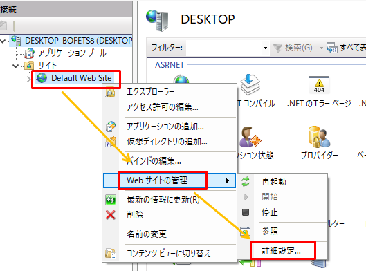 1.「Default Web Site」→「Webサイトの管理」→「詳細設定」をクリックします。