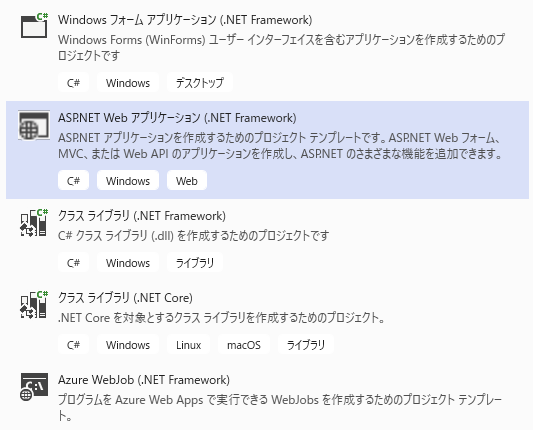 2.C#の記載がある「ASP.NET Webアプリケーション(.NET Framework)」を選択し「次へ」を押します。(検索欄にASP.NETと入力すると表示されます)