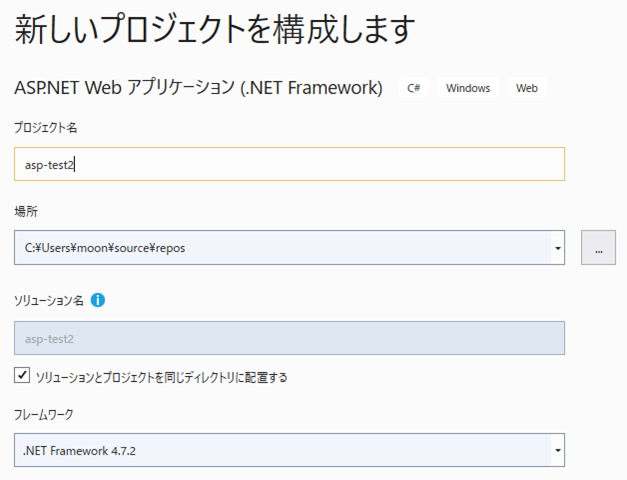プロジェクト名はasp-test2にしました。「作成」ボタンを押します。
