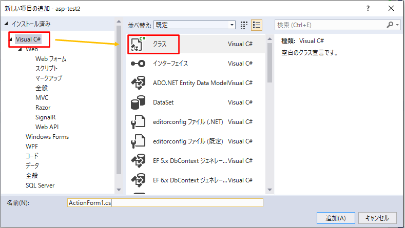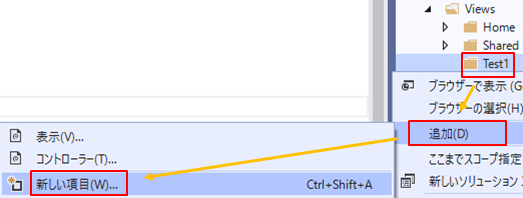 1.右にあるソリューションエクスプロラーのViewsフォルダの下のTest1フォルダを右クリックして「追加」→「新しい項目」をクリックします。