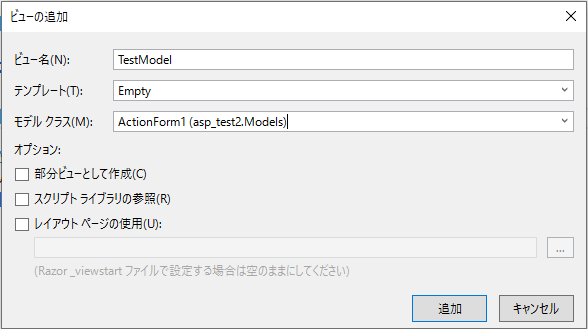 2.テンプレートは「Empty」、モデルクラスは、作成した「ActionForm1」を指定し「追加」を押します。レイアウトページの使用のチェックは外しました。