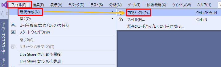 または、「ファイル」→「新規作成」→「プロジェクト」をクリックします。