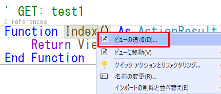 1.コントローラのコードのFunctionの行のあたりで右クリックし「ビューの追加」をクリックします。
