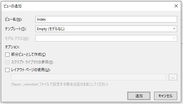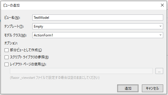 2.テンプレートは「Empty」、モデルクラスは、作成した「ActionForm1」を指定し「追加」を押します。レイアウトページの使用のチェックは外しました。